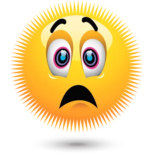 Um sol amarelo com expressão de surpresa e preocupação, olhos arregalados e sobrancelhas levantadas.