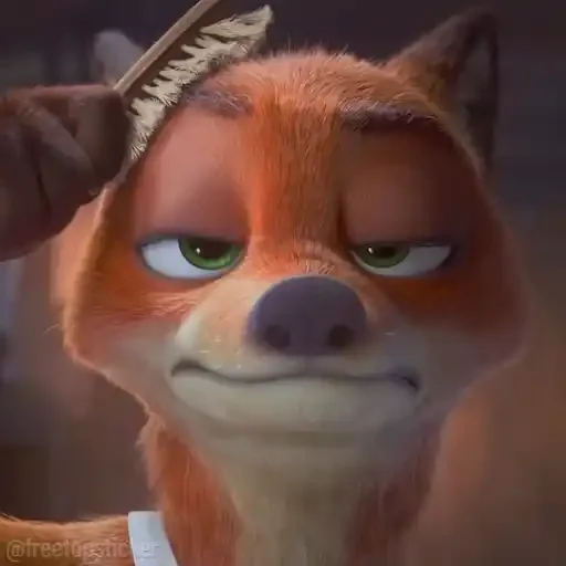 Raposa animada com expressão facial séria e olhar penetrante, orelha erguida com uma pena presa, fundo escuro.