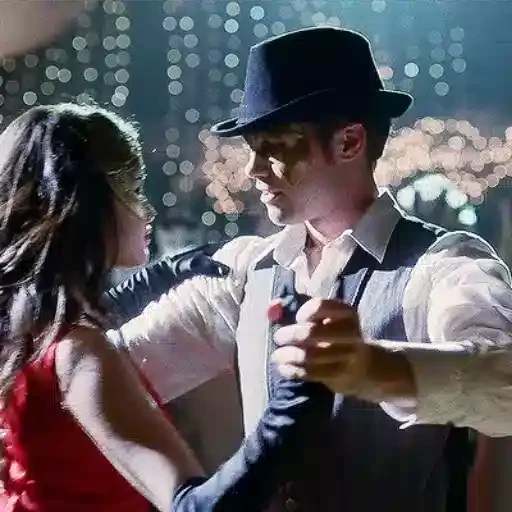 Um homem dançando com uma mulher em um ambiente noturno. Ele está usando um chapéu preto e um terno cinza com camisa branca.