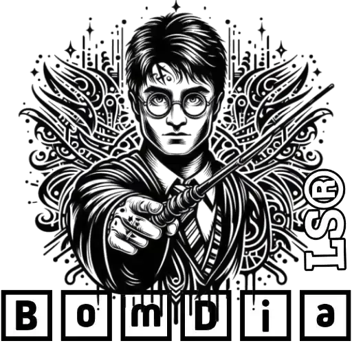 Harry Potter com varinha mágica e óculos, em frente a um fundo decorativo, com a frase 'Bom Dia' embaixo.