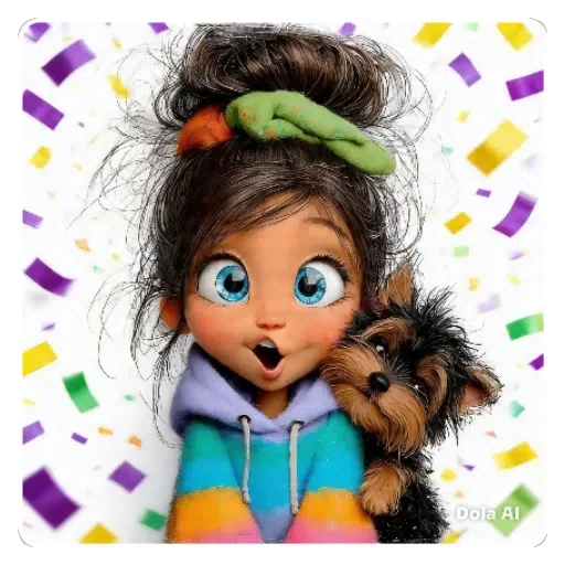 Menina de olhos azuis e cabelo castanho com um laço verde, usando uma blusa colorida, segura um cachorro preto e castanho, com confetes coloridos ao fundo.