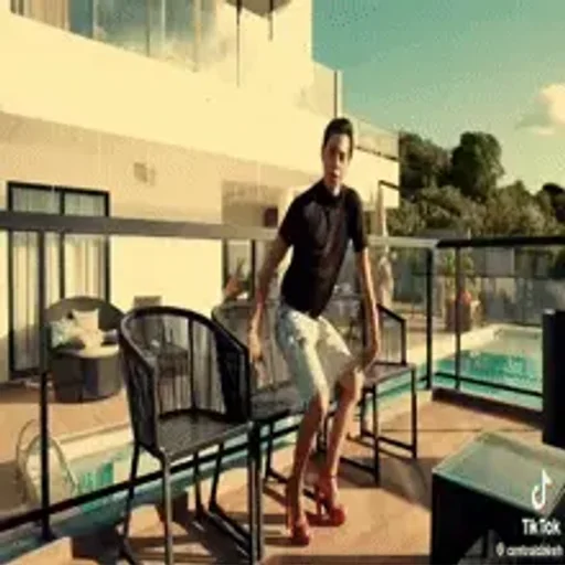 Um homem de pé ao lado de uma mesa em um terraço com piscina e edifício ao fundo, com o logotipo do TikTok no canto inferior direito.