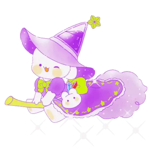 Um desenho de um animal branco com orelhas de gato, usando um chapéu de bruxa roxo e montado em uma vassoura mágica com uma pequena criatura branca ao lado.