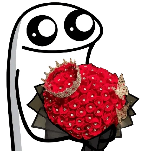 Um personagem de desenho simples com um sorriso tímido e bochechas rosadas segurando uma rosa vermelha.