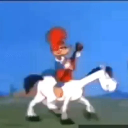 Um personagem de anime monta um cavalo branco com uma expressão determinada, usando um chapéu vermelho alto e um uniforme vermelho e branco.