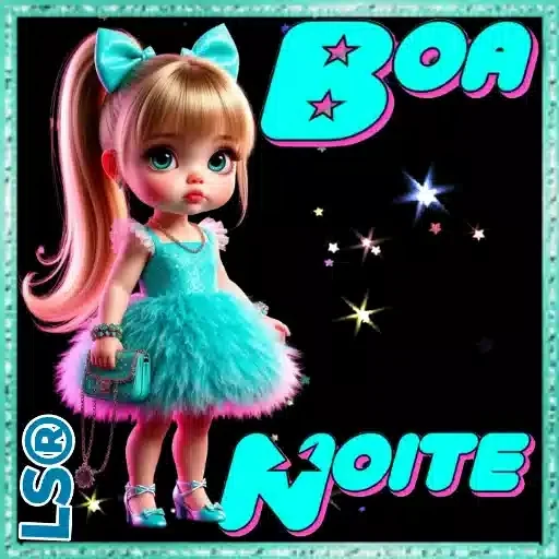Uma menina de cabelo castanho com mechas rosa e um laço azul na cabeça, vestida com um vestido azul e rosa, contra um fundo preto com estrelas. A imagem traz o texto 'BOA NOITE' em letras azuis.