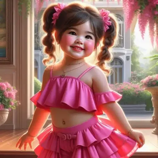 Menina com cabelo castanho escuro em coque duplo com flores cor-de-rosa, vestindo uma roupa rosa com várias saias. Ela está em frente a uma janela com flores.