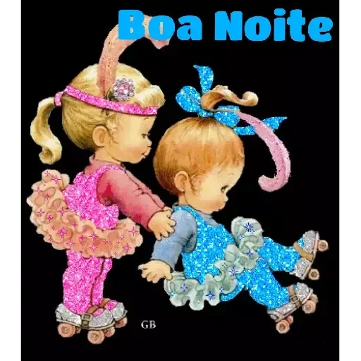 Duas meninas de patins, uma de rosa e outra de azul, segurando as mãos. 'Boa Noite' está escrito em azul acima delas.