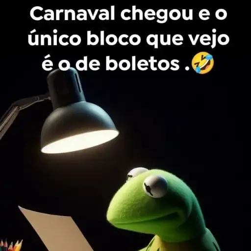 Kermit sentado em frente a uma lâmpada, olhando para uma folha de papel, com a frase 'Carnaval chegou e o único bloco que vejo é o de boletos.'