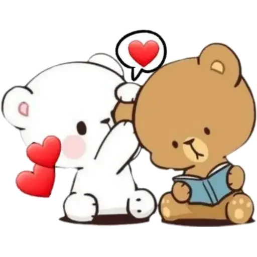 Dois ursinhos fofos, um branco e um castanho, com corações vermelhos. O ursinho castanho tem um livro e um coração na fala.