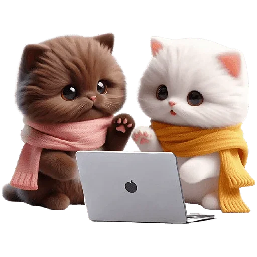 Dois gatinhos fofos, um marrom e um branco, usando cachecóis, olham para uma tela de laptop. O gato marrom tem um cachecol rosa e o branco um laranja.