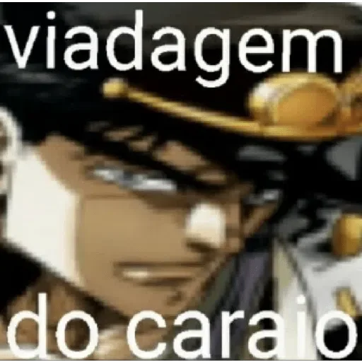 Um personagem de anime com expressão séria e um chapéu preto com detalhes dourados. Sobreposto, o texto 'viagem do caralho'