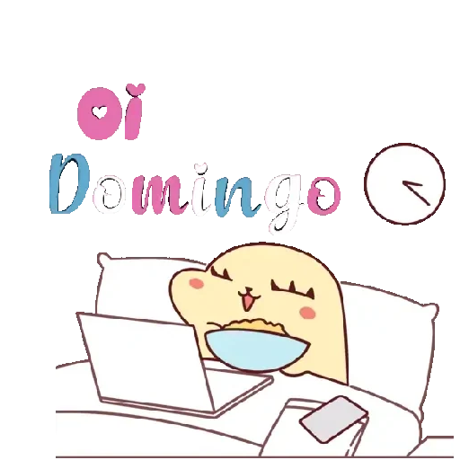 Um desenho de um pássaro amarelo deitado na cama com um laptop, comendo uma tigela de comida, ao lado de um celular e um relógio. A imagem traz o texto 'Oi Domingo'.