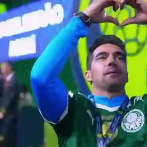Jogador de futebol fazendo um gesto de coração com as mãos, usando uma camisa verde e azul, com um logo no peito.