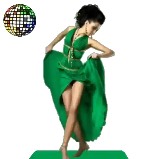 Mulher dançando em um vestido verde, com uma bola de discoteca colorida ao fundo.
