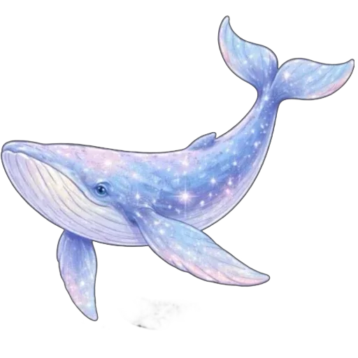 Baleia azul com manchas brancas e rosa, corpo com aspecto de nebulosa estrelada.