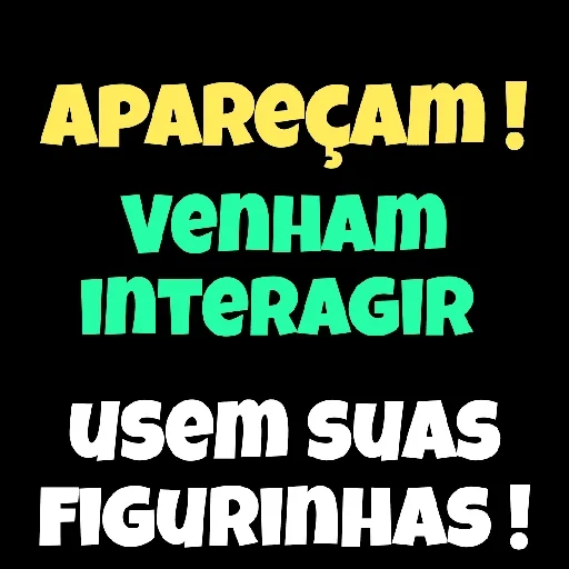 Um texto colorido em um fundo preto. As frases 'APAREÇAM!', 'VENHAM INTERAGIR' e 'usem SUAS FIGURINHAS!' aparecem em amarelo, verde e branco, respectivamente.