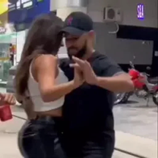 Um homem e uma mulher dançando em um ambiente urbano, ele de camisa preta e boné, ela de top branco e calça preta.