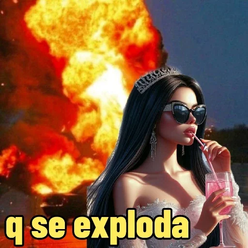 Uma mulher loira com tiara, óculos de sol e um copo de bebida rosa, com uma grande explosão de fogo ao fundo. A legenda 'q se exploda' aparece em texto amarelo.