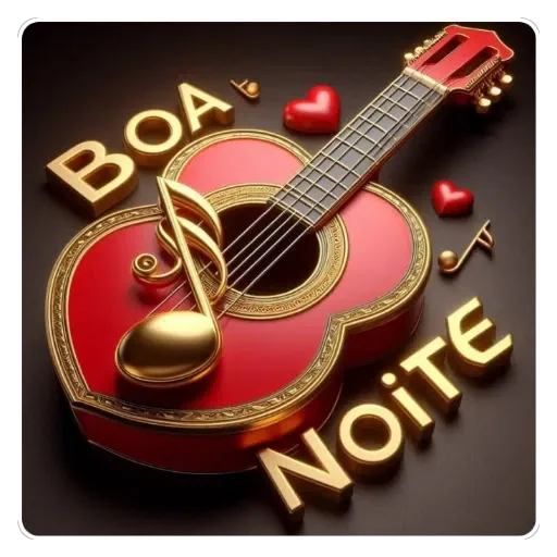 Um violão vermelho com detalhes em dourado, acompanhado de uma clave de sol e corações vermelhos. Abaixo e ao lado, as palavras 'BOA NOITE' em letras douradas.