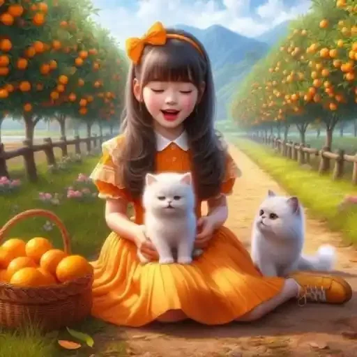 Menina com vestido laranja sentada no chão com dois gatos brancos, um no colo e outro ao lado, em um pomar de laranjas com cesta de laranjas ao lado.