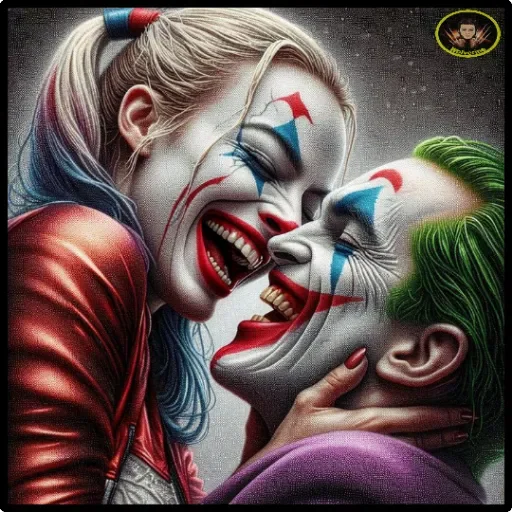Joker e Harley Quinn se beijando, com maquiagem colorida e expressões alegres. O Joker tem um sorriso largo e dentes afiados, enquanto Harley Quinn tem um laço no cabelo.