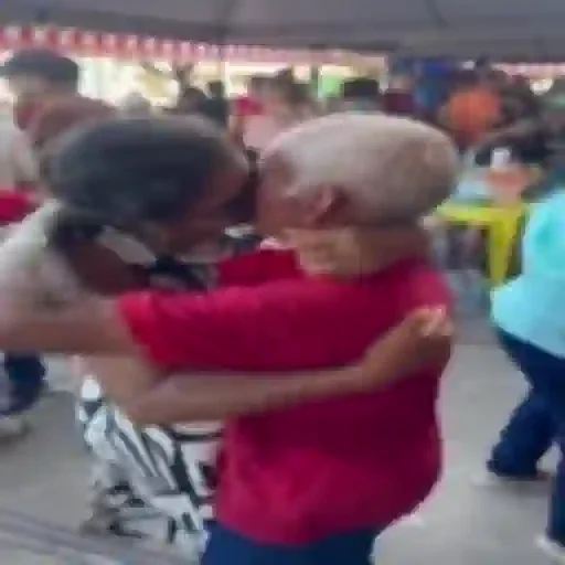 Um casal de idosos dançando em um ambiente festivo. O homem tem cabelo branco e veste uma camisa vermelha, enquanto a mulher tem cabelo preto e veste uma blusa branca com saia preta e branca.