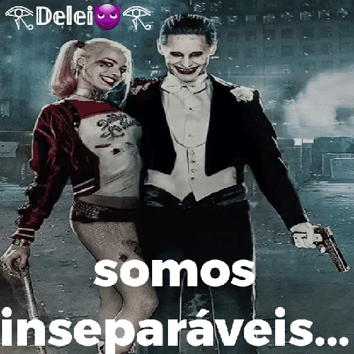 Harley Quinn e Coringa lado a lado, com o texto 'somos inseparáveis...' na frente. Harley tem um look feminino com penteado rosa, jaqueta vermelha e preta, e óculos de coração. O Coringa usa um terno preto e branco.