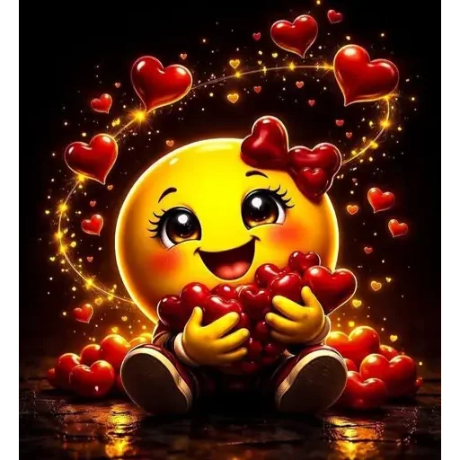Um emoji amarelo sorridente com laços vermelhos no cabelo, segurando corações vermelhos em um ambiente noturno com luzes e corações ao redor.