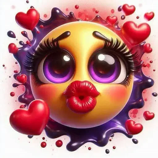 Rosto de uma mulher com olhos grandes e roxos, cílios longos, lábios vermelhos e bochechas rosadas, cercado por corações vermelhos e respingos de tinta roxa e vermelha.