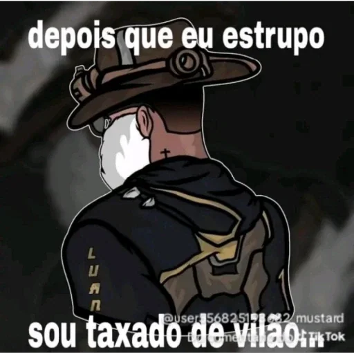 Um personagem de anime com cabelos brancos e um chapéu marrom, com o texto 'depois que eu estrupo sou taxado de vilão'