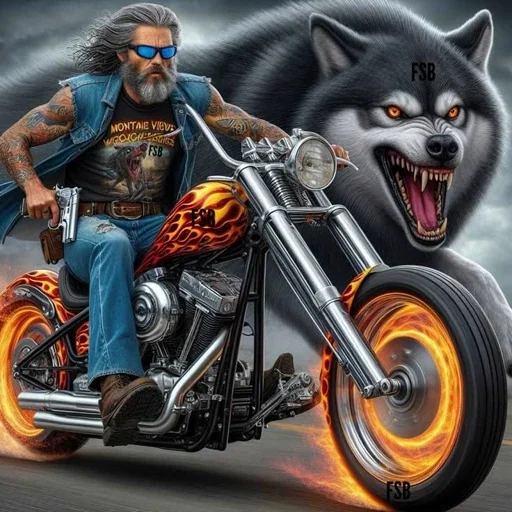 Um homem com cabelos longos e óculos azuis anda de moto com um lobo feroz ao fundo. A moto tem detalhes em chamas e o homem veste uma jaqueta azul e calça jeans.