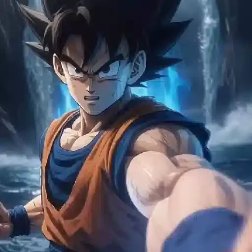 Personagem de anime com cabelo preto espetado e olhos semicerrados, vestindo uma camisa laranja e azul, com expressão de concentração ou raiva, em um fundo azul escuro com efeitos de luz.