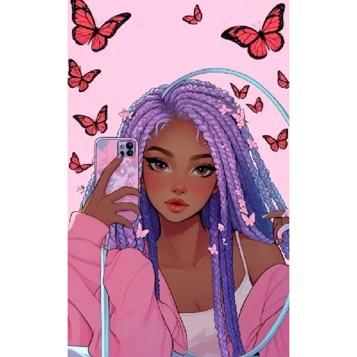 Uma jovem mulher com tranças roxas e um casaco rosa está tirando uma selfie com um celular rosa, cercada por borboletas cor-de-rosa.