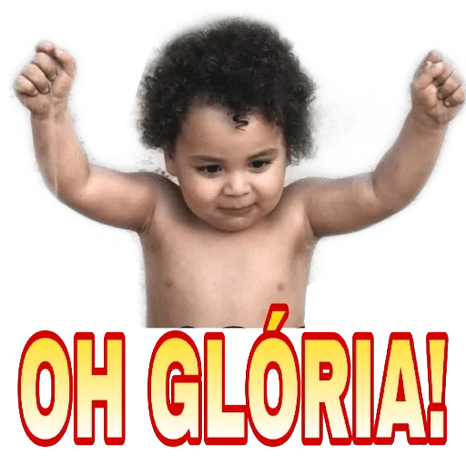 Um bebê negro com expressão séria e cabelos afro, com os braços levantados e a frase 'OH GLÓRIA!' em letras grandes e vermelhas.