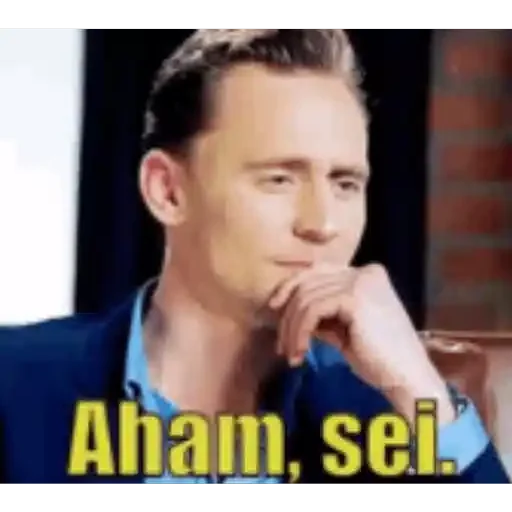 Um homem com cabelo castanho e um blazer azul, com a mão no queixo e expressão pensativa, e o texto 'Aham, sei.' em amarelo na parte inferior.