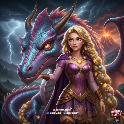 Uma mulher loira com uma longa trança, vestida com uma roupa roxa e dourada, está ao lado de um dragão colorido com chifres e olhos brilhantes. O fundo mostra um céu tempestuoso com raios.