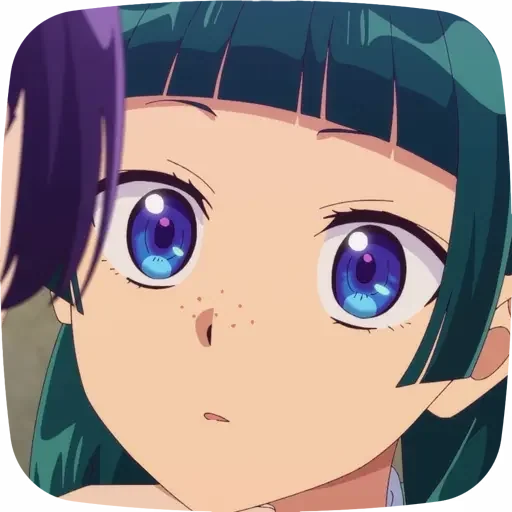 Rosto de uma jovem anime com olhos azuis e cabelos verde-escuros, expressão surpresa ou curiosa.