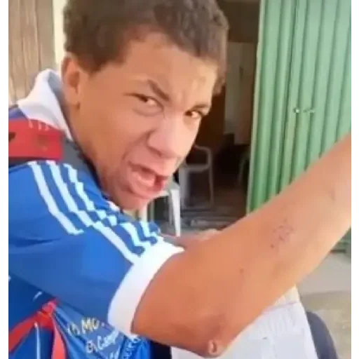 Homem com camisa azul e branca fazendo careta, com a língua para fora.