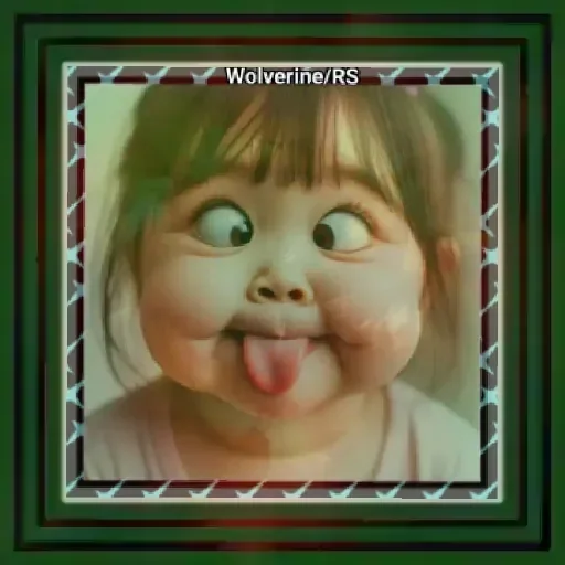 Menina com expressão engraçada, língua para fora e olhos arregalados, emoldurada com borda colorida e o texto 'Wolver Nerds' em cima.