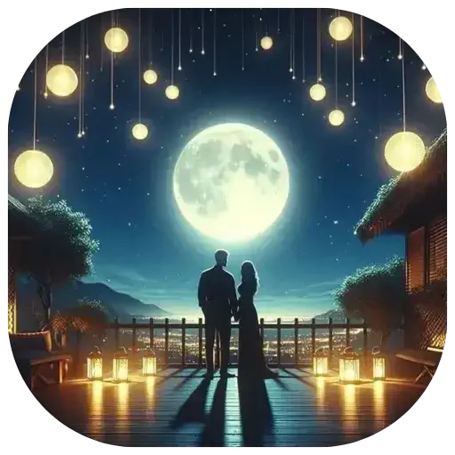 Um casal observa a lua cheia em uma noite romântica, com lanternas penduradas e velas no chão.