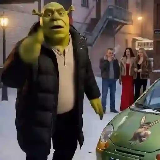 Shrek com expressão séria, vestindo um casaco preto e uma camisa branca, fazendo um gesto com a mão. Está em frente a um carro verde com Donkey no capô.