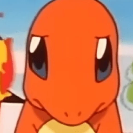 Um desenho do Charmander, um dos iniciais do Pokémon, com expressão facial séria e olhos arregalados.
