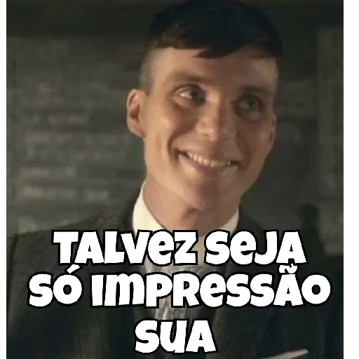 Um homem de cabelo preto curto e sorriso leve, com texto em branco sobreposto: 'TALVEZ SEJA SÓ IMPRESSÃO SUA'