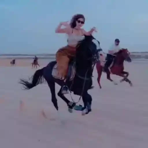 Mulher montada em um cavalo preto fazendo um gesto com a mão, enquanto outro cavalo e cavaleiro passam ao fundo em uma praia.