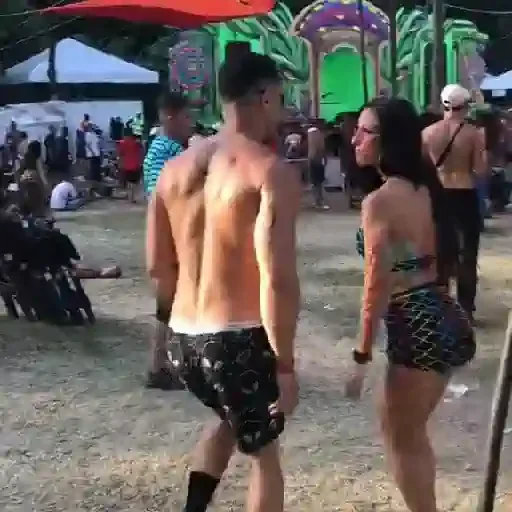 Casal sem camisa em um festival ou evento ao ar livre, com palco colorido ao fundo.