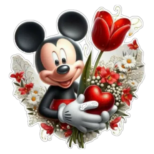 Mickey Mouse sorri com um coração vermelho na mão, rodeado de flores vermelhas, brancas e verdes.