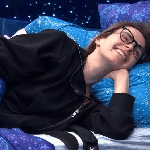 Uma mulher deitada na cama com um travesseiro azul, usando óculos e um moletom preto, com fones de ouvido, em um quarto com estrelas no teto.