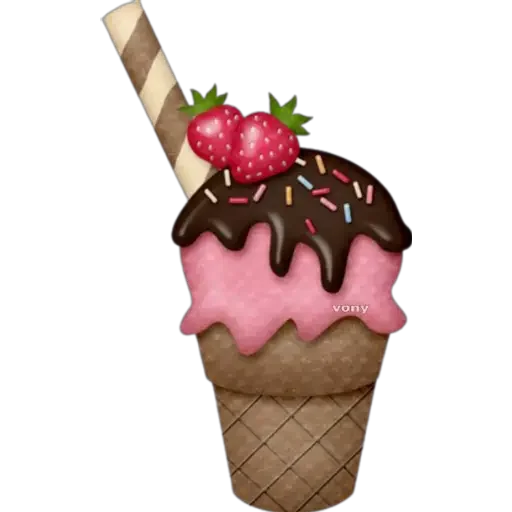 Um sorvete de morango em um cone, coberto com chocolate, confeitos coloridos e duas morangas frescas, com um palito de waffle.