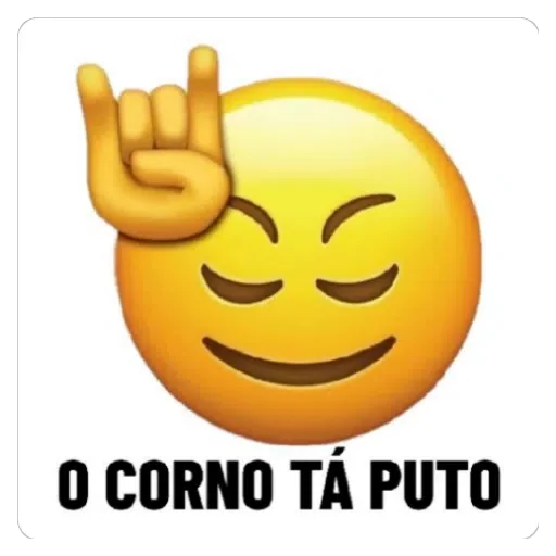 Um emoji de rosto sorridente com os olhos fechados e a mão fazendo o gesto 'rock on', com o texto 'O CORNO TÁ PUTÔ' abaixo.